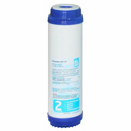 Картридж с активированным гранулированным углём. Обеспечивает универсальную очистку воды от растворённых примесей, таких как свободного хлора, хлорорганических соединений, пестицидов, нефтепродуктов, тяжёлых металлов и иных органических и неорганических веществ.