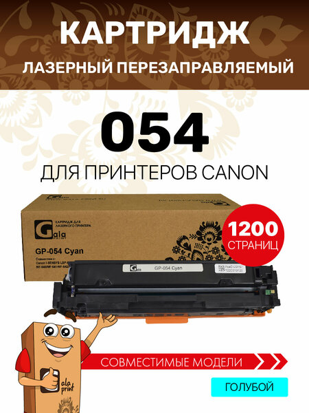 Cовместимый лазерный картридж 054 голубого цвета подходит для принтеров Canon i-SENSYS LBP-620/LBP-621/LBP-623/MF-640/MF-641/MF-642/MF-643/MF-644/MF-645. При производстве расходных материалов GalaPrint используются только качественные комплектующие. Картриджи GalaPrint не уступают оригинальным, полностью совместимы с заявленными моделями принтеров, обеспечивают естественную цветопередачу и хорошее качество печати. Важно. Производитель имеет право, не уведомляя заказчика, вносить изменения в конструкцию и комплектацию картриджа, без ухудшения его потребительских свойств. В случае наличия оранжевых транспортировочных фиксаторов, защитных крышек, шторок и чеки/запорной ленты их нужно извлекать. Ресурс картриджа составляет - 1200 страниц формата А4 при 5% заполнении.