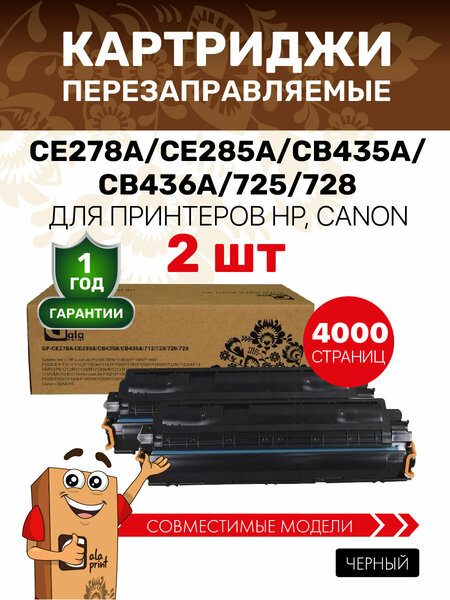 Универсальный совместимый лазерный картридж CE278A / CE285A / CB435A / CB436A / 712 / 725 / 726 / 728 для принтеров HP LaserJet Pro M1536 / M1536dnf / P1566 / P1606 / P1606dn / P1101 / P1102 / P1102w / P1103 / P1104 / P1106 / P1108 / P1109 / M1132 / M1132s / M1136 / M1137 / M1212 / M1212nf / M1212nfw / M1213 / M1214 / M1214nfh / M1216 / M1217 / LaserJet P1001 / P1002 / P1003 / P1004 / P1005 / P1006 / P1007 / P1008 / P1009 / M1120 / M1120n / M1522 / M1522n / M1522nf / M1505 / M1505n / Canon i-SENSYS LBP6000 / LBP6020 / LBP6030 / MF3010 / LBP6000B / LBP6020B / LBP6030B / LBP6030w / MF3010 / MF3010EX / LBP6200 / LBP6230 / LBP6200d / LBP6230dw / FAX-L150 / FAX-L170 / FAX-L410 / MF4410 / MF4430 / MF4450 / MF4550 / MF4570 / MF4580 / MF4730 / MF4750 / MF4780 / MF4890. Этот картридж подходит для лазерных принтеров. Он совместим с устройствами hp и canon. С помощью данного комплектующего можно распечатать документы формата А4. Черный тонер обеспечивает высокое качество печати. Данный катридж содержит чернила, которые подходят для офисного или домашнего использования. Заправка легкая и быстрая благодаря специальному отверстию. Это позволяет экономить на расходных материалах и поддерживать постоянное качество распечатки. Лазерный аппарат быстро справляется с большими объемами работы. Вы сможете без проблем печатать фотографии и текстовые документы. Комплект подходит для большинства моделей компьютерных принтеров, что делает его универсальным решением. Порошок внутри катриджа обеспечивает стабильную работу устройства на протяжении всего срока службы. Используйте этот черный картридж для получения четких штампов на бумаге. При производстве расходных материалов GalaPrint используются только качественные комплектующие. Картриджи GalaPrint полностью совместимы с заявленными моделями принтеров, обеспечивают естественную цветопередачу и высокое качество печати. Важно. Производитель имеет право, не уведомляя заказчика, вносить изменения в конструкцию и комплектацию картриджа, без ухудшения его потребительских свойств. В случае наличия оранжевых транспортировочных фиксаторов, защитных крышек, шторок и чеки/запорной ленты их нужно извлекать. Ресурс картриджа составляет - 2000 страниц формата А4 при 5% заполнении страницы.