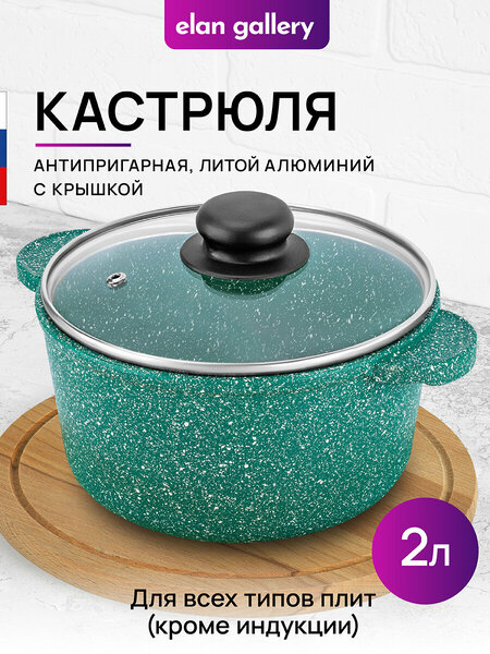 Кастрюля Elan Gallery "Изумруд" из серии "Гармония вкуса" объёмом 2 литра с крышкой равномерно разогревается и распределяет тепло таким образом, что продукты в ней остаются сочными и сохраняют все полезные свойства и аромат. Диаметр стеклянной крышки – 18 см, диаметр дна – 17 см. Кастрюля с прозрачной крышкой выполнена из толстостенного литого алюминия и имеет ультрапрочное двухслойное антипригарное покрытие Cookmark. Покрытие устойчиво к царапинам и износу, полностью безопасно для здоровья и не содержит PFOA или других вредных веществ. Крышка изготовлена из жаропрочного стекла и имеет пароотвод. Алюминиевая кастрюлька с толстыми дном и стенками выполнена в стильном дизайне и позволит приготовить дома суп, кашу, плов или любой гарнир. Порадуйте близких супом с фрикадельками, борщом или куриной лапшой. Удобна для приготовления пасты, так как макаронные изделия не будут прилипать на дно благодаря антипригарной поверхности. Суповая кастрюля подойдёт для тушения и варки блюд из мяса, рыбы и овощей. Эксплуатация: кухонную утварь не нагревать без продуктов. Дайте посуде остыть, прежде чем помещать ее в воду. Использовать только деревянные и силиконовые приборы. Не мыть абразивными или щелочными моющими средствами. Использовать в ПММ только в режиме "Эко" с применением средств, не содержащих щелочи. Подходит для стеклокерамических, газовых и электрических плит. Не подходит для индукционных плит! Без крышки можно использовать в духовой печи при температуре до 250 градусов. Теперь для использования в духовке не понадобится отдельная ёмкость. Кастрюля станет идеальным подарком для женщин на 8 Марта или День Рождения и придаст процессу приготовления пищи новый уровень комфорта. Подарите такую универсальную вещь маме, подруге, сестре или бабушке. Красивая кастрюля – мечта любой хозяйки! В серии "Гармония вкуса" вы найдёте любой кухонный инвентарь: сковороды, кастрюли, блинницы, казаны и жаровни. Соберите набор для вашей кухни или столовой в едином стиле!