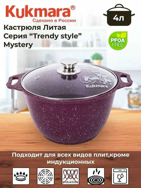 Яркие акценты для вашей кухни с коллекцией Trendy style. Цветная посуда подарит хорошее настроение и невероятные возможности для того, чтобы поразить своих гостей не только изысканным вкусом блюд, но и тем, как они выглядят! Посуда линии Trendy style с внешней стороны и внутренней стороны покрыта антипригарным покрытием увеличенной прочности, абсолютно безопасным для здоровья , без PFOA. Антипригарное покрытие надолго сохраняет первозданную яркость и привлекательность посуды, а превосходные антипригарные свойства будут радовать на протяжении очень долгого времени. Допускает использование только деревянных и силиконовых предметов. Покрытие не требует особенного ухода, легко моется как вручную, так и в посудомоечной машине (в режиме Eco без предварительного замачивания). Кастрюля Kukmara хорошо подходит для варки, тушения и томления, так как имеет отличные теплораспределительные и теплоаккумулирующие свойства, и блюда в ней получаются сочными и ароматными. Цельнолитые ручки позволяют использовать кастрюлю в духовом шкафу. Функциональность посуды увеличивает стеклянная крышка из термостойкого стекла, благодаря которой можно наблюдать за приготовлением пищи и не снимать крышку каждый раз, теряя при этом изрядное количество тепла. Стеклянная крышка комплектуется ручкой из нержавеющей стали, благодаря которой допускается использование ее в духовом шкафу. Кастрюля Kukmara с антипригарным покрытием имеет проточенное дно, которое обеспечивает максимальное прилегание дна посуды к плите для более быстрого и равномерного нагрева. Преимущества кастрюли Kukmara: значительная толщина стенок и дна исключает деформацию корпуса кастрюли; возможность использования минимального количества масла; усиленная антипригарная система; продукты не пригорают и сохраняют свой вкус; легкость мытья; подходит для всех типов плит, кроме индукционных. Процесс приготовления еды приятнее вместе с посудой Kukmara!