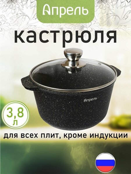 Кастрюля с антипригарным покрытием Апрель. Кастрюля 3,8 литра, полезный объем 3,8 л. Цвет: черный. Диаметр: 22 см. Диаметр дна: 17 см. Высота: 12,5 см. Толщина стенки: 3,8 мм. Толщина дна: 4,5 мм. Посуда для кухни кастрюля подходит для всех типов плит, кроме индукционных. Кастрюля с крышкой можно использовать в посудомоечной машине. Кастрюля стеклянная крышка является незаменимой на кухне. В кастрюле можно приготовить много интересных блюд: наваристые супы, соусы, тушеное мясо и даже десерты. Сверхпрочное антипригарное покрытие отличается особой износостойкостью и превосходными антипригарными свойствами, рассчитано на интенсивное использование в течение длительного срока. Набор кастрюль из литого высококачественного пищевого алюминия станет надежным помощником на вашей кухне. Также можно купить кастрюля 3л, 4л, 5л, 6л. Кастрюля и сковорода отлично дополняют друг друга. Ручки позволяют использовать кастрюлю в духовом шкафу. Функциональность посуды увеличивает стеклянная крышка из термостойкого стекла.