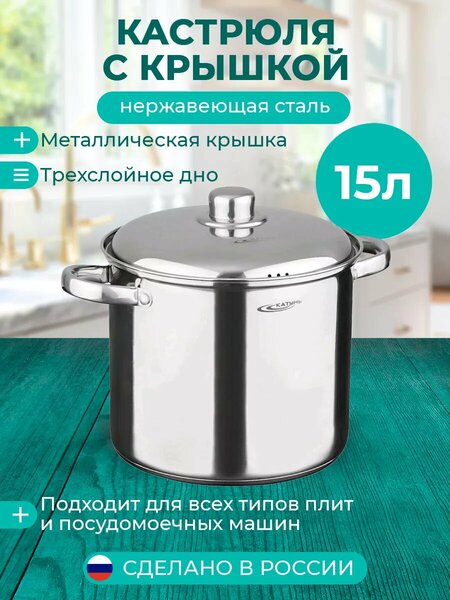Кастрюля серии "Гретта" 15 л диаметр 30 см выполнена из высококачественной нержавеющей стали. Благодаря трехслойному термоаккумулирующему дну происходит равномерное распределение температуры по всей поверхности, что обеспечивает быстрое приготовление. Крышка выполнена из металла, оснащена ручкой и отверстиями для выпуска пара. Ручки надежно прикреплены с помощью заклепок. Наружная полировка - зеркальная. Подходит для всех видов плит, в том числе и для индукционных. Кастрюлю можно мыть в посудомоечной машине. Сделано в России.