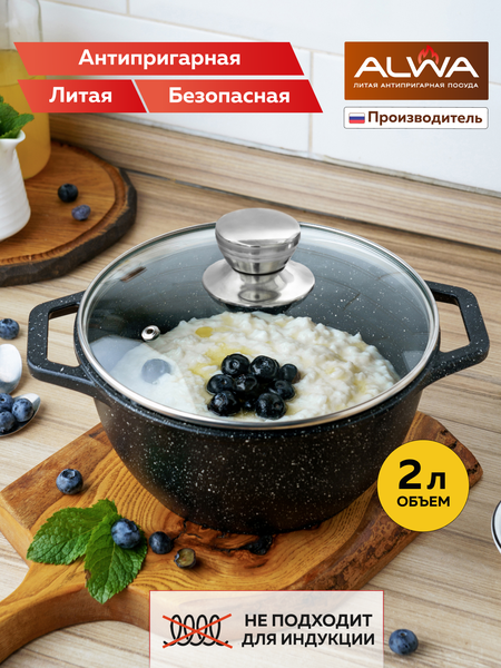 Кастрюля 2 л с крышкой от ТМ ALWA – это прочная и легкая литая алюминиевая посуда с антипригарным покрытием на водной основе. Имеет толстые стенки и дно, благодаря чему происходит равномерный нагрев поверхности, тепло сохраняется дольше. Цельнолитые ручки позволяют использовать казанок в духовом шкафу. При готовке используйте прихватки. Казанок с крышкой в комплекте из термостойкого стекла, пароотводом и окантовкой из нержавеющей стали. Казан можно мыть в посудомоечной машине с использованием средств с низким уровнем рH. При приготовлении пищи обязательно используйте деревянную либо силиконовую лопатку. Кастрюлька подходит для всех типов плит и духовок, кроме индукционных. Вся кухонная утварь нашего бренда производится в России. Благодаря высокотехнологичному оборудованию, она безупречного качества и по доступной цене, соответствует стандартам качества и ГОСТ. Технология ручного литья с кристаллизацией под давлением увеличивает срок службы. Не содержит LEAD (свинец), CADMIU (кадмий), PFOA (Перфтороктановая кислота), безопасно для приготовления детского питания. Возможно готовить с минимальным количеством масла. Преимущества товара: Прочность и долговечность литой алюминиевый корпус и антипригарное покрытие обеспечивают длительный срок службы. Равномерное распределение тепла благодаря толстостенному корпусу и дну пища быстро и равномерно нагревается, обеспечивая идеальное приготовление. Экономия времени и сил не нужно постоянно контролировать процесс, так как стеклянная крышечка позволяет сохранять температуру и предотвращает пригорание пищи. Простота ухода Мечта каждой хозяйки, она легко моется и не требует специального ухода. Кастрюли и сковороды, набор кастрюль прекрасно впишется в любой интерьер и станет украшением. Продукция от ТМ Альва–это отличный подарок маме, бабушке, сестре, девушке на день рождения. Подарок мужчине, любимому, папе на юбилей. Термокастрюля, кастрюля маленькая отличное решение для рыболовного лагеря.