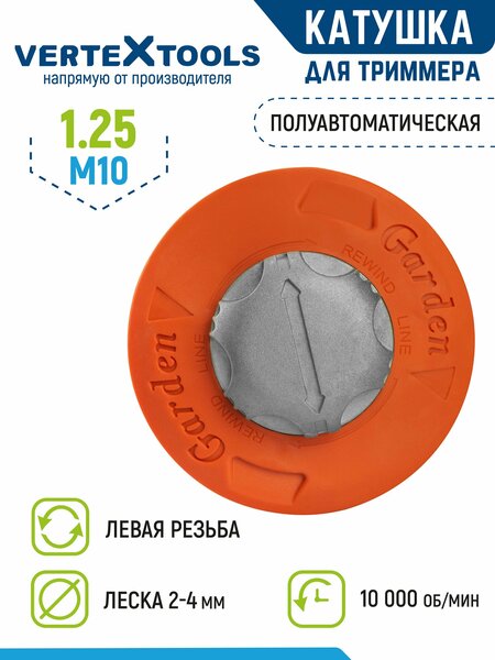 Надежность: Конструкция устойчива к ударам и нагрузкам, что делает катушку идеальной для работы на сложных и каменистых участках. Легкая загрузка лески: Упрощает процесс замены лески, экономя время и усилия. Высокая производительность: Полуавтоматическая подача лески обеспечивает эффективную работу без перерывов. Универсальность: Совместимость с большинством триммеров и бензокос благодаря стандартной резьбе M10x1.25 левая. Катушка или головка триммера является важной составляющей садового инструмента, отвечающей за эффективное и качественное кошение травы. Надежность и продуманная конструкция катушки VertexTools головка A002 делают ее отличным выбором как для профессионалов, так и для любителей садовых работ.