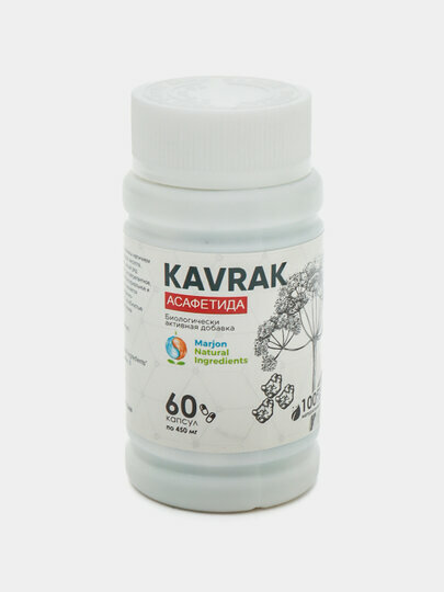 Биологически активная добавка к пище KAVRAK Не является лекарством Ингредиентный состав: Смола асафетиды (ферула вонючая) При болях суставов, при артрите, артрозе и остеохондрозе. Обладает антиаллергическим, ранозаживляющим, иммуностимулирующим, антимикробным действием. Это сильное средство, улучшающее работу желудочно-кишечного тракта при запорах, расстройствах. Асафетида улучшает кишечную микрофлору, устраняет кишечные газы, спазмы и боли. Стимулирует рост бифидобактерий. Эффективно выводит жиры и холестерин из организма. Применяется для снижения избыточной массы тела (коррекции веса), очищения организма от шлаков и токсинов, при атеросклерозе, гиперхолестеринемии, нарушениях кальциевого обмена, дисбактериозе кишечника, язве желудка и 12-перстной кишки. Стимулирует пищеварение, ветрогонное, отхаркивающее, противоглистное, антисептическое и афродизическое средство. Действие на организм: · антиоксидантное · при болях суставов · антибактериальное · антигельминтное · желчегонное · снижает холестерин · афродизическое · снижает артериальное давление; · снижает сахар в крови. Рекомендации к применению как дополнительное средство при: при боля суставов, остеохондрозе, артрите, артрозе, бронхиальной астме, атеросклерозе, онкологических заболеваниях, глистах, импотенции, неврозе, болезнях печени, язве желудка и 12-перстной кишки; сердцебиении, эпилепсии, туберкулезе легких; вздутии живота, запорах, расстройствах ЖКТ, сахарном диабете, улучшает кишечную микрофлору, устраняет кишечные газы, спазмы и боли; коррекции веса, очищении организма от шлаков и токсинов, нарушении кальциевого обмена, дисбактериозе. Область применения: в качестве биологически активной добавки к пище – источника эфирного масла, феруловой кислотой, витаминов и микроэлементов. способ употребления: взрослым по 1 капсуле 3 раза в день. Рекомендуемая доза составляет от 1500-2500 мг в сутки для взрослых. Длительность приема - 1-2 месяца. Перед применением рекомендуется проконсультироваться с врачом. Противопоказания: Не рекомендуется принимать при индивидуальной непереносимости компонентов БАД Условия хранения: Хранить в сухом и защищённым от света, недоступном для детей месте, t° не выше +20°С и относительная влажность воздуха не выше 70%. 100% натуральный. Срок годности: 24 месяцев.