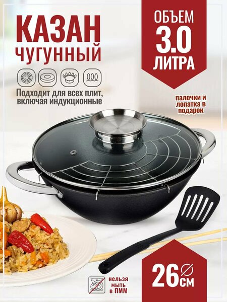 Казан чугунный с крышкой 3 литра — это идеальный выбор для тех, кто ценит настоящую кулинарию и хочет готовить вкусные блюда с душой! Если вы мечтаете о том, чтобы ваши любимые рецепты стали еще более насыщенными и ароматными, этот казан станет вашим незаменимым помощником на кухне и на природе. Давайте подробнее рассмотрим, почему именно этот казан должен занять место в вашем арсенале! Почему стоит выбрать чугунный казан? 1. Идеальная теплоемкость: Чугун — это материал, который равномерно распределяет тепло, что позволяет вашим блюдам готовиться равномерно и сохранять все ароматы. Забудьте о подгорании и пересушивании! С этим казаном ваши блюда всегда будут идеальными. 2. Универсальность: Казан подходит для приготовления различных блюд — от плова и супов до тушеного мяса и овощей. Вы можете использовать его как на плите, так и на открытом огне или в духовке. Это делает его отличным выбором как для домашней кухни, так и для пикников или дачных выездов. 3. Объем 3 литра: Этот размер идеально подходит для приготовления пищи на небольшую семью или компанию друзей. Вы сможете легко накормить всех своих близких вкусными домашними блюдами! 4. Качественная крышка: В комплекте с казаном идет надежная крышка, которая помогает сохранить тепло и влагу внутри. Это значит, что ваши блюда будут готовиться быстрее и сохранят все свои полезные свойства. 5. Долговечность: Чугунный казан прослужит вам долгие годы при правильном уходе. Он устойчив к механическим повреждениям и не боится высоких температур, что делает его идеальным выбором для активного использования. Если вы увлекаетесь кулинарией или просто хотите порадовать свою семью вкусными блюдами — этот казан станет вашим верным помощником на кухне. Не упустите возможность сделать свои кулинарные шедевры еще более вкусными и ароматными! Закажите чугунный казан с крышкой 3 литра уже сегодня и погрузитесь в мир настоящей кулинарии! Пора готовить с удовольствием и радовать своих близких изысканными блюдами!