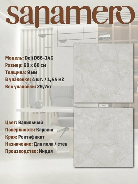 Керамогранит Sanamero Deli является ректифицированным (обрезным), т. е. каждая плитка имеет одинаковый размер, что облегчает работу мастера и дает возможность укладки с минимальным швом. Такой керамогранит создает визуально практически монолитные поверхности, он эффектно смотрится и прост в уходе.