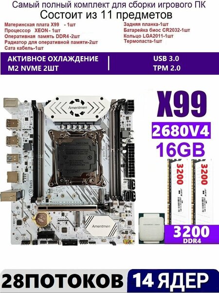 Комплект для сборки игрового пк : Материнская плата X99A4 c дополнительным охлаждением Процессор XEON-E5-2680v4, Оперативная память DDR4 8GB-2шт Радиатор для оперативной памяти-2шт Сата кабель-1шт Задняя планка-1шт Батарейка биос CR2032-1шт Кольцо переходник для кулера LGA2011-1шт Термопаста-1шт Характеристики Название бренда Amentmen Тип разъема LGA 2011-3 Поддержка памяти типа DDR4 Сценарий использования GAMING, Аудио и видео, Домашнее хозяйство, Офис, DESIGN, Видео продукции, Промышленный компьютер, Рабочая станция, Server, Научных вычислений, 3-D моделирование, Рендер видео, MaxCompute, Другой, Форм-фактор Микро-ATX Чипсет H81/B85/C612 Производитель чипсета İntel Максимальный объем оперативной памяти 256 ГБ Канал памяти Двойной Для хранения Тип интерфейса SATA 2, SATA 3, M.2 (NVMe) Стандарты PCI - E PCI - E 3,0 Задние Порты ввода/вывода 1x RJ45, PS/2 Кол-ва PCI 1 Количество слотов для памяти 4 Количество PCIe x 16 1 Встроенный LAN 1x RJ45 1000mb Совместимость с процессором Intel Xeon e5 v3 v4 Все комплекты перед отправкой были проверены на брак. Игровой комплект обеспечит высокую производительность, как в рабочих задачах, так и в самых современных играх.