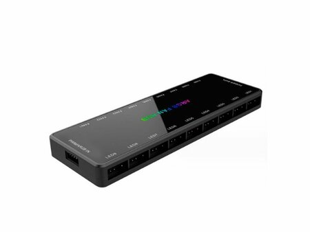 Хаб для подключения A-RGB устройств черный ( с подсветкой) , 9 портов для подключения питания вентиляторов pwm (4pin), 9 портов для подключения подсветки A-RGB 5v 3pin, крепится к корпусу на двухсторонний скотч ( в комплекте) Хаб не управляет подсветкой и подразумевает подключение к контроллеру или разъему ARGB на материнской плате, без контролирующего устройства подсветка работать не будет.