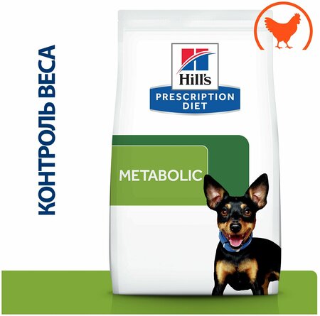 Даже небольшой лишний вес влияет на качество жизни собаки: ухудшается общее состояние здоровья, остаётся меньше сил на игры, собака становится менее подвижной, увеличивается риск заболеваний, связанных с избыточным весом. Диетологи и ветеринарные специалисты Hill's разработали Prescription Diet Metabolic - диетический корм, созданный для лёгкого снижения и контроля веса с учётом всех потребностей собак. Этот корм помогает вашей собаке сжигать жир и дает энергию для активных игр. С уникальной смесью клетчатки собаки всегда сыты и довольны между кормлениями. 96% собак успешно снизили вес в домашних условиях за 2 месяца с Hill's Prescription Diet Metabolic.* Попробуйте сухой корм с курицей с великолепным вкусом, который понравится вашей собаке. *Внутренние данные Hill's Pet Nutrition. Рекомендован Основные показания: - Снижение веса - Поддержание веса (склонные к ожирению или после потери веса) - Сахарный диабет у собак, страдающих ожирением - Гипотиреоз - Синдром Кушинга Другие показания: - Сахарный диабет у собак с нормальным весом или умеренным избыточным весом Не рекомендован Щенкам, беременным или кормящим собакам Как это работает: Ускоряет метаболизм и помогает собакам естественным образом сжигать больше калорий Помогает запустить естественную способность организма сжигать больше калорий Уникальная смесь клетчатки: собаки чувствуют себя сытыми и довольными между кормлениями Как это помогает: 96% собак снизили вес за 2 месяца в домашних условиях Помогает сохранить здоровый вес и обеспечивает энергией для активной жизни Легкое снижение веса у собак с почти теми же порциями Отмечен знаком S+OXSHIELD: разработан для улучшения состояния мочевыводящей системы, снижает риск образования кристаллов струвита и оксалата кальция Дополнительная информация: Hill's Prescription Diet Metabolic сухой диетический корм обеспечивает собаку необходимыми нутриентами для снижения и контроля веса. Подходит для постоянного кормления, помогает легко и эффективно снизить вес вашей собаки. Ваш ветеринарный специалист может дополнительно рассказать, как Hill's Prescription Diet помогает собакам наслаждаться счастливой и активной жизнью. Можно смешивать сухой и влажный корм и кормить им одновременно. состав: злаки, производные растительного происхождения, мясо и производные животного происхождения (курица 8%), экстракты растительного белка, овощи, масла и жиры, семена, минералы. 3107 Ккал/кг (311 Ккал/100г) Нутриент В пересчете на сухое вещество1 % Протеин 27.7 % Жир 12 % Углеводы 40.3 % Клетчатка 14.1 % Зола 5.8 % Кальций 0.87 % Фосфор 0.68 % Калий 0.84 % Натрий 0.36 % Магний 0.142 % Таурин 0.12 % Витамин А 10867 IU/kg Витамин С 145 ppm Витамин D 754 IU/kg Витамин Е 1165 IU/kg Омега-3 жирные кислоты 0.72 % Омега-6 жирные кислоты 2.3 % Бета-каротин 2.31 ppm Ссылки 1Питательное вещество в продукте после удаления влаги. Используется для прямого сравнения питательных профилей продуктов с разным уровнем содержания влаги.