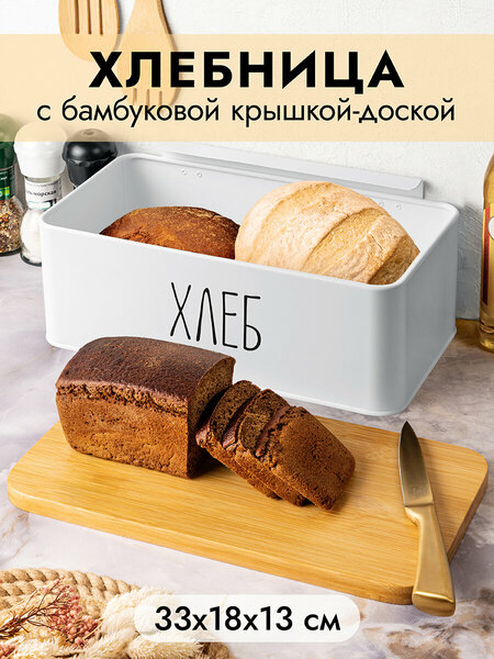 Белая хлебница 33х18х13 см с бамбуковой крышкой-доской поможет сохранить хлеб и булочки вкусными и свежими. Украшена надписью "Хлеб". Хлебница из металла не впитывает запахи, держит температуру, предотвращает попадание влаги, а значит – защитит продукты от плесени. Настольная хлебница имеет стильный дизайн и надежно закрывается бамбуковой крышкой. Её особенность – необычный функционал 2 в 1. Вам больше не понадобится отдельная доска для того, чтобы нарезать хлеб перед подачей на стол. Просто откройте крышку и используйте её как доску. Ёмкость можно приспособить не только под хлеб, но и для хранения пакетов с крекерами, печеньем, сухарями. Бамбуковые детали нельзя замачивать. Поставляется в стильной картонной упаковке. Металлическая хлебница подойдёт в подарок любой хозяйке. Такая посуда станет настоящим украшением вашей кухни и поможет создать в доме порядок и уют!