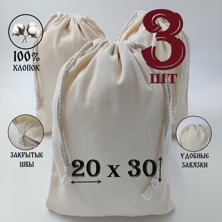 Хлопковый мешочек 20 на 30 см с самозатягивающимися хлопковыми завязками - 3 шт.