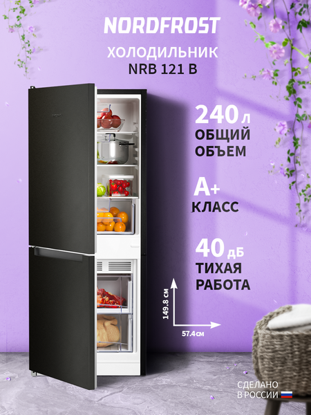Двухкамерный отдельностоящий холодильник NORDFROST NRB 121 с нижним расположением морозильной камеры имеет общий объем 240 л. Устройство с системой оттаивания DeFrost характеризуется высоким классом энергоэффективности А+ и низким уровнем шума до 40 дБ. Морозильная камера с полезным объемом 70 л имеет ручную систему размораживания и мощность заморозки до 2,5 кг в сутки. Холодильник оснащен LED-освещением в холодильной камере, которое не выделяет тепло во внутреннее пространство холодильника, а также отличается экономичностью и долгим сроком службы. Диапазон температурного режима в холодильной камере 0…+8°С, в морозильной не выше -18°С. В холодильнике NORDFROST NRB 121 B продуманное для удобства пользователя внутреннее пространство: - ламинированная внутренняя поверхность холодильника с антибактериальным покрытием; - 3 полки из закаленного стекла в холодильном отделении; - большой выдвижной ящик для овощей и фруктов; - 2 полки на двери; - 2 прозрачных ящика в морозильном отделении позволяют поместить и длительно хранить большие куски мяса, полуфабрикаты и другие замороженные продукты; Внутренняя посуда холодильника имеет красивый серебристый отлив и инфографику на ящиках и дверных полках. При необходимости чистки или замены уплотнитель двери легко снимается и ставится обратно. Возможность перенавешивания двери создает удобство открывания с нужной стороны. Холодильник в современном исполнении подходит под любой дизайн кухни. Горизонтальные интегрированные ручки задают стиль и комфортное пользование устройством. Гарантия на холодильник NORDFROST – 2 года.