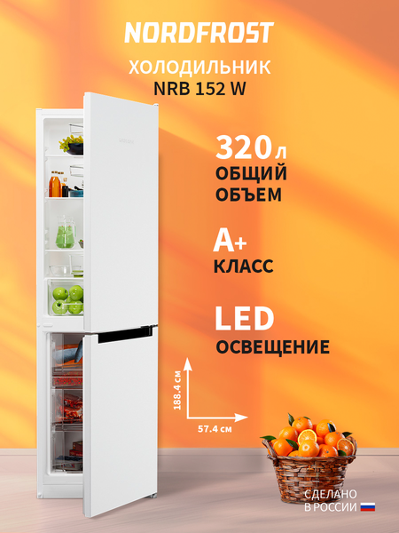 Двухкамерный отдельностоящий холодильник NORDFROST NRB 152 с нижним расположением морозильной камеры имеет общий объем 320 л. Устройство с системой размораживания DeFrost характеризуется высоким классом энергоэффективности А+ и низким уровнем шума до 40 дБ. Морозильная камера с полезным объемом 115 л имеет ручную систему размораживания и мощность заморозки до 4,5 кг в сутки. Холодильник оснащен LED-освещением в холодильной камере, которое не выделяет тепло во внутреннее пространство холодильника, а также отличается экономичностью и долгим сроком службы. Диапазон температурного режима в холодильной камере 0…+8°С, в морозильной не выше -18°С. В холодильнике NORDFROST NRB 152 продуманное для удобства пользователя внутреннее пространство: - ламинированная внутренняя поверхность холодильника с антибактериальным покрытием; - 4 полки из закаленного стекла в холодильном отделении; - большой выдвижной ящик для овощей и фруктов; - 3 полки на двери; - 3 прозрачных ящика в морозильном отделении: 2 повышенного объема позволяют поместить и длительно хранить большие куски мяса, курицу целиком и другие объемные замороженные продукты; - лоток для заморозки ягод. Внутренняя посуда холодильника имеет красивый серебристый отлив и инфографику на ящиках и дверных полках. При необходимости чистки или замены уплотнитель двери легко снимается и ставится обратно. Возможность перенавешивания двери создает удобство открывания с нужной стороны. Холодильник NORDFROST NRB 152 обладает современным исполнением и подходит под любой дизайн кухни. Горизонтальные интегрированные ручки задают стиль и комфортное пользование устройством. Гарантия на холодильник NORDFROST – 2 года. Холодильники NORDFROST – всегда сохранение свежести и качественное хранение продуктов!