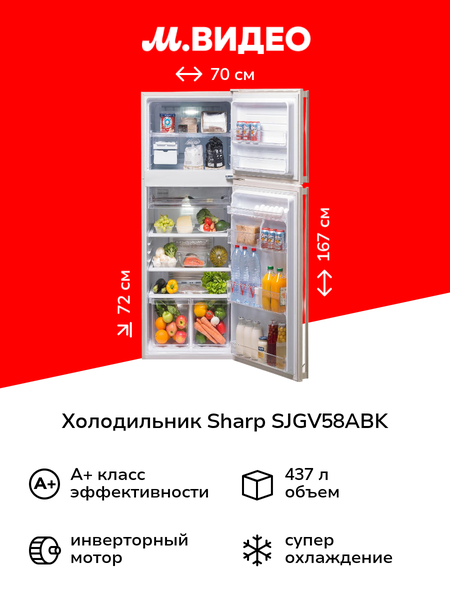 Холодильник Sharp SJGV58ABK, черный - элегантная модель с фасадом, отделанным прочным закаленным стеклом. Глянцевая и абсолютно ровная поверхность эффектно выглядит, легко поддается очистке и превращает бытовой прибор в заметный элемент интерьера. В холодильнике используются самые современные технологии, призванные продлить свежесть продуктов. Технология ионизации и очистки воздуха Plasmacluster нейтрализует бактерии и предотвращает развитие плесени и появление неприятного запаха. Система охлаждения Hybrid Cooling отвечает за равномерное и быстрое охлаждение. Экономичное энергопотребление и тихая работа обеспечиваются инверторным компрессором: в год расходуется 384 кВт*ч, что соответствует классу А+, уровень шума не превышает 39 дБ. Холодильная камера оборудована четырьмя стеклянными полками, пятью дверными карманами и двумя контейнерами для хранения фруктов и овощей. На задней стенке расположена металлическая панель, которая компенсирует повышение внутренней температуры при открывании двери. В расположенном сверху морозильном отделении - одна полка, плюс одна полка на двери. Мощность замораживания составляет 6,5 кг в сутки. Управление электронное сенсорное, можно активировать режимы Суперохлаждение и Отпуск. Если дверь слишком долго остается открытой, звучит сигнал. Размораживание автоматическое и производится по системе No Frost. Климатический класс Т - прибор эффективно работает практически в любом климате.