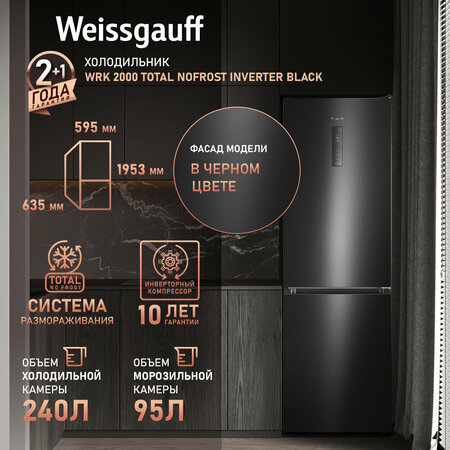Отдельностоящий холодильник Weissgauff оснащенный инверторным двигателем, выполненный в чёрном цвете, обладающий полной системой размораживания Total No Frost и фантастической вместительностью - это соотношение превосходной эргономики внутреннего пространства, технологического совершенства и великолепия внешнего дизайна! Габариты устройства 595 х 635 х 1953 мм - это оптимальные параметры, при выборе которых инженеры Weissgauff руководствовались целью создать для вас максимально вместительный и функциональный холодильник, который при этом окажется удобен в установке и не будет занимать лишнее место на вашей кухне! Объем холодильной камеры 240 литров - дает вам полную уверенность в том, что вы легко сможете разместить в холодильнике сразу все необходимые продукты. А особая эргономика внутренних полок позволит вам оптимизировать внутреннее пространство камеры в случае необходимости! Объем морозильной камеры 95 литров, обеспечит гарантию того, что данная модель предоставит вам достаточно места для заморозки и длительного хранения продуктов! Зона свежести, оснащенная функцией контроля влажности, позволит подобрать оптимальный режим для хранения овощей, фруктов и других продуктов, требовательных к поддержанию особого микроклимата. Технология Multi Air Flow, перенаправляет потоки холодного воздуха в обеих камерах вашего устройства для обеспечения наилучшего эффекта охлаждения помещенных продуктов! Система размораживания Total No Frost - это наиболее передовая и эффективная система охлаждения обеих камер устройства (и холодильной, и морозильной), обеспечивающая принудительную циркуляцию холодного воздуха и предотвращающая образование наледи на стенках! Инверторный двигатель с гарантией 10 лет - это совершенно новая ступень эффективности в сравнении с традиционными линейными моделями! Уменьшенное энергопотребление, минимизация уровня шума, а также увеличение срока службы вашего холодильника - вот лишь некоторые из преимуществ, которые дает инверторная технология в этом замечательном устройстве от Weissgauff! Модуль электронного управления TOUCH CONTROL позволит вам буквально в несколько прикосновений настроить параметры холодильника согласно вашим пожеланиям, что сделает работу с данной моделью еще более удобной и комфортной! Функция суперзаморозки способна перевести морозильное отделение на максимально низкую температуру на короткий срок, позволяя тем самым быстро и эффективно заморозить свежие продукты, помещенные в морозильную камеру! Класс энергопотребления А++ позволит вам еще раз убедиться в том, что Weissgauff способны создавать по-настоящему эффективные устройства, не расходующие при этом больше электричества, чем необходимо! LED-освещение, автоматически активирующееся при открывании дверцы холодильной камеры, наполнит ваш холодильник мягким и кристально чистым светом, позволяющим легко увидеть все расположенные в нем продукты! Перенавешиваемые двери позволят вам самостоятельно выбрать, в какую сторону будет осуществляться открывание холодильника, что особенно важно при планировании его размещения на кухне! Полки, выполненные из закаленного стекла, это уверенность в их надежности и долговечности, ведь мы в Weissgauff знаем, как важно внимание к каждой детали, когда речь идет о действительно качественной бытовой технике!