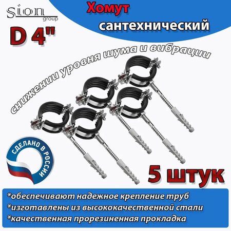 Хомут сантехнический D 4" (5 шт) для труб с резиновым уплотнением, шпилькой и дюбелем
