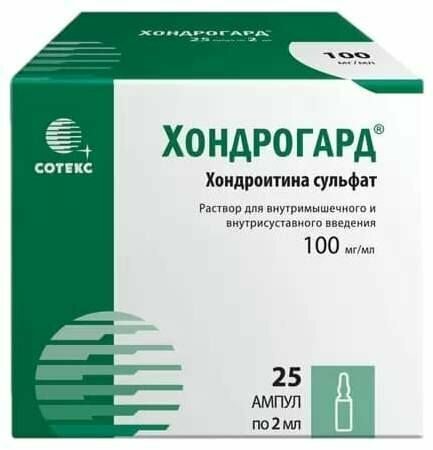В/м, по 100 мг через день. При хорошей переносимости дозу увеличивают до 200 мг, начиная с 4-й инъекции. Курс лечения — 25–30 инъекций. При необходимости через 6 мес возможно проведение повторного курса лечения. При остеоартрозе крупных суставов возможно сочетание внутрисуставного и в/м способов введения. Проводят до 5 внутрисуставных инъекций по 200 мг с перерывом 3 дня между введениями и 16 в/м инъекций по 200 мг с интервалом 1 день между введениями (через день). В зависимости от размера сустава в суставную полость можно ввести до 2 мл препарата ХОНДРОГАРД®. Для формирования костной мозоли курс лечения составляет 3–4 недели (10–14 инъекций в/м через день). Дети. Отсутствуют данные по безопасности и эффективности применения препарата в педиатрической практике. Способ применения В/м и внутрисуставное введение. Внутрисуставное введение препарата осуществляется в асептических условиях специалистом, прошедшим обучение технике внутрисуставного введения. После внутрисуставного введения препарата место прокола обрабатывают спиртовой салфеткой, накладывают бактерицидный пластырь.