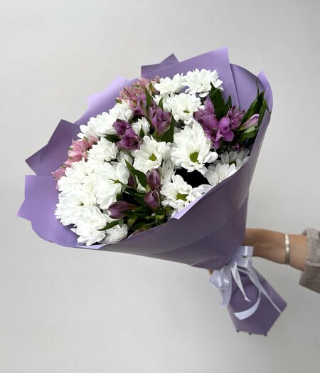 Этот сборный букет состоит из 9 цветов, включая 4 хризантемы и 5 альстромерий. Букет оформлен в стильных фиолетовом, розовом и белом цветах, что делает его ярким и запоминающимся. Высота букета составляет 50 см, что делает его достаточно большим, чтобы произвести впечатление, но не слишком большим, чтобы быть громоздким. Сборка букета осуществляется на стеблях, что позволяет цветам дольше сохранять свежесть и красоту. Такой букет подойдет для любого повода, будь то день рождения, день свадьбы, юбилей или просто знак внимания. Он будет уместен как для делового партнера, так и для любимой, мамы или бабушки. Цветы, букеты, композиции от 5 Цветов – это всегда свежие и яркие цветы, которые подарят радость и улыбку.