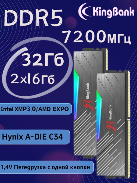 Оперативная память KingBank Dark Soarblade RGB DDR5 UDIMM 7200MHz Drak Heatsink (Hynix A-die C34) 2x16 ГБ представляет собой высокопроизводительное решение для вашего компьютера. Тип памяти DDR5 с 288-контактным разъемом U DIMM обеспечивает более высокую производительность по сравнению с предыдущими поколениями. Частота 7200 МГц позволяет значительно повысить скорость отклика системы, что делает работу с приложениями более плавной и быстрой. Используя чип Hynix A-die, оперативная память обладает отличным потенциалом производительности и стабильности. Это гарантирует, что ваш компьютер будет работать надежно и без сбоев. Материал радиатора из алюминиевого сплава толщиной 2 мм эффективно улучшает рассеивание тепла и обеспечивает стабильную работу памяти. Общая емкость составляет 32 ГБ, состоящая из двух блоков памяти объемом 16 ГБ, что позволяет удовлетворить потребности многозадачности и крупномасштабной работы с программным обеспечением. Компактная конструкция с размерами 133,8x41,8x8 мм подходит для различных шасси и обеспечивает легкую установку. Напряжение 1,4 В обеспечивает высокую производительность и улучшает контроль энергопотребления. Разумные настройки синхронизации CL 34-45-45-115 обеспечивают эффективность чтения и записи данных. Совместимость с платформами Intel XMP 3.0 и AMD EXPO гарантирует, что оперативная память будет работать на платформах Intel и AMD без проблем. Оснащенная световыми эффектами ARGB, оперативная память позволяет добавлять персонализированные цвета компьютеру, создавая уникальный и стильный внешний вид. Срок службы составляет 20 лет, что гарантирует долгосрочную надежность и производительность.