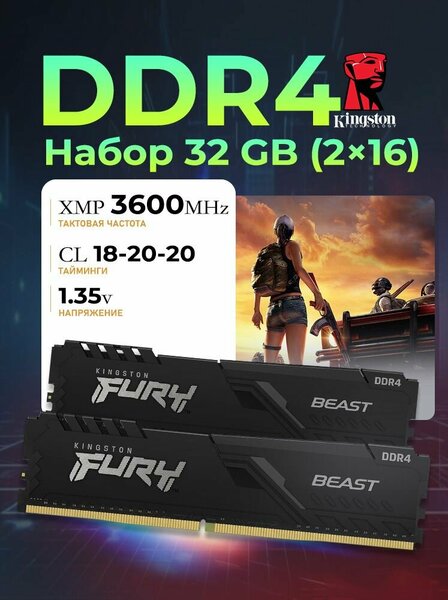 Kingston FURY Beast Black 32GB (2x16GB) DDR4 3600MHz - это набор из двух модулей оперативной памяти объемом по 16 ГБ каждый, которые обеспечивают высокую производительность вашего компьютера. Эти модули работают с частотой 3600 МГц и имеют ширину полосы передач данных до 28800 Мбит/с, что позволяет значительно ускорить работу приложений и игр. Основные преимущества Kingston FURY Beast Black 32GB (2x16GB) DDR4 3600MHz: