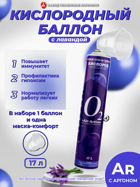 Кислородный баллончик AIR-ACTIVE 17л лаванда, с маской Кислородный баллончик "AIR-ACTIVE" содержит в составе 75% Кислорода и до 25% Аргона (благородный инертный газ). Это оптимальное сочетание газов высшей очистки не сушит слизистую оболочку и способствует лучшему усвоению кислорода организмом человека, а значит - более быстрой детоксикации (очищению) организма. Доставляет приятные ощущения при дыхании, освежает и тонизирует. Применяется для устранения кислородного голодания (т. н. гипоксии), нормализации метаболизма (обмена веществ и энергообмена) в организме человека. Увеличения умственной и физической работоспособности и выносливости. -Баллончик размерами 65х330 мм, объемом 1 литр, содержит 17 литров кислородной смеси, рассчитан на 110-150 вдохов (это примерно на 10-12 минут обычного спокойного дыхания) - Не сушит слизистую оболочку при дыхании и быстрее обогащает кровь кислородом, более безопасен при эксплуатации и хранении - Стимулирует регенерацию тканей организма - Устраняет кислородное голодание (т. е. гипоксию) - Очищает организм (в т. ч. для быстрого снятия похмельного синдрома, последствий отравлений) - Нормализует обмен веществ - Увеличивает умственную и физическую работоспособность (рекомендуется профессиональным спортсменам для более быстрого восстановления при подготовке к соревнованиям) - Повышает иммуннозащитные силы организма - Для достижения аромаэффекта может выпускаться с эфирными маслами: бергамот (антистресс, улучшает настроение), мята перечная (освежает, очищает, повышает работоспособность и концентрацию), хвойная (стимулирует жизненные силы, дает энергию), лаванда (оказывает релаксирующее действие) - Срок годности 24 месяца