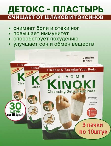 Детоксикационный пластырь kinoki очищает организм от токсинов, используется для профилактики заболеваний, повышает иммунитет и способствует общему оздоровлению организма. Турмалиновый пластырь киноки предназначен для наклеивания на стопы, ведь именно они считаются самым большим местом скопления биологически активных точек. Уникальные пластыри состоят из пакетика - патча с лечебным фитопорошком и гладкой наклейки с фиксирующим материалом: медицинским клеем. Состав фитопорошка включает 5 активных и 30 вспомогательных компонентов. Это древесный и бамбуковый уксусы, турмалин и бразильский дикий гриб, декстрин и имбирь: ингредиенты обладают вытягивающими токсины свойствами. Китайский пластырь будет эффективен при нарушении работы сердца и суставов, полезен при мигрени и общем недомогании, кожных проблемах, аллергии, снижении иммунитета, болях в суставах и нарушении пищеварения. Согревающий пакетик с имбирем выводит токсины и шлаки, улучшает работу почек, удаляет избыток влаги. Разогревающая смесь устраняет боль и отеки ног, улучшает кровообращение, расслабляет мышцы тела, нормализует сон и снимает усталость, активизирует обмен веществ, помогает справиться с простудой, улучшить общее состояние организма человека. Пластырь, выводя токсины, способствует похудению и эффективному детоксу (detox), может использоваться не только на ступнях, но и на любой части тела, на лице. Мощный препарат с активными натуральными компонентами заменит аптечные лекарства, подойдет для снятия мигрени, избавит от головной боли и прогонит бессонницу. Патчи применяют для лечения и удаления угревой сыпи, прыщей и акне, заживления кожи и борьбы с постакне, для защиты от новых высыпаний.