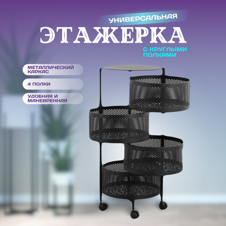 Универсальная этажерка на колесиках выполнена в новом круглом дизайне. Металлическая этажерка с круглыми полками оснащена четырьмя металлическими полками-уровнями. Четыре полки выдвигаются из этажерки вращающимся движением в сторону. Каждая полка имеет перфорацию, поэтому обеспечена вентиляция содержимого и предотвращение скопления влаги. Этажерка универсальна в своём применении. Этажерка для кухни идеально подойдет для кухни для фруктов и для овощей. Можете использовать этажерку для ванной для хранения банных принадлежностей в ванной комнате для книг в гостиной или для игрушек в детской. Также для удобства этажерка оснащена колёсиками и подойдет для рассады для обуви для книг. Что ещё больше увеличивает количество вариантов использования тележки. Как и где использовать удобную и эстетичную тележку - вопрос ваших потребностей и фантазии.
