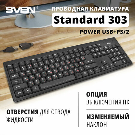 Клавиатура проводная Эргономичный дизайн Высококачественная мембрана Стандартный набор клавиш Две дополнительные клавиши управления питанием ПК Комфортный, тихий и четкий ход клавиш Переходник USB к PS/2 в комплекте