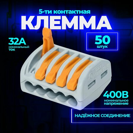 Клеммы для проводов аналог wago тип клемы ваго. Клеммник аналог Wago. Клемма соединительная для проводов 222-415 (аналог клеммы wago) представляет собой блок с плоско-пружинным зажимом, предназначенный для подключения любых типов медных и алюминиевых проводов: моножильных и многожильных, тонкопроволочных. Как для мастеров, так и для любителей, с помощью клеммники для проводов значительно упрощается электромонтаж и проводка. Зажим крокодил для проводов осуществляется при помощи оранжевых рычагов клемы. Наличие специального паза в корпусе клеммы для размещения рычага в закрытом положении надежно фиксирует контакты и предотвращает случайное отсоединение проводника. Имеется возможность измерения электрических параметров цепи без разбора Wago клеммы и нарушения изоляции соединения, а так же клеммники wago можно использовать многократно. Клеммники Ваго изготовлены из негорючего полиамида, который обеспечивает надежную изоляцию соединения. wago клемма на 5 проводников имеет контакт из луженой латуни с плоско-пружинными зажимами. Клемма рассчитана на подключение внутри помещений проводов диаметром от 0,08 мм до 4 мм. Для монтажа клемы для проводов не требуется специального инструмента. Клемма соединительная 222-415 (аналог клемм ваги) отличное электрооборудование и хороший набор строителя. Соединение для проводов для проводов входят в набор любого электрика и применяются везде, где осуществляется электромонтаж или проводка кабеля и универсальный обжимной инструмент. В коробке электромонтажный , профессиональный, универсальный, строительный набор который позволит осуществить ремонт проводок дома. Крепеж для проводов – соединительный, пружинный и быстросъемный фиксатор, который позволяет соединить электро провод (алюминий или медный, одножильный и многожильный силовой электрический кабель). wago клемма 5 – обжимной соединитель, который обеспечивает надежное крепление и соединение и снятие кабеля не применяя припой. Для работы необходима зачистка проводов. Изоляция снимается с кабеля и пластина прижимает кабель или провод. Любой ремонт, будь то, только что приобретенная квартира, где используется старая электрика или проводка, новый светильник или другой кабельный электро прибор. Этот электромонтажный универсальный товар соединит любой кабель и станет незаменимым помощником электрика. Комплект клемм включает в себя следующее: коробка и плоский монтажный коннектор в количестве 50 штук. Данный инструмент представляет собой блок с плоско-пружинным зажимом, предназначенный для подключения любых типов медных и алюминиевых проводов: моножильных и многожильных. Как для мастеров, так и для любителей, с помощью клеммы Ваго значительно упрощается электромонтаж и проводка. Зажим крокодил для проводов осуществляется при помощи оранжевых рычагов клеммы. Наличие специального паза в корпусе клеммы для размещения рычага в закрытом положении надежно фиксирует контакты и предотвращает случайное отсоединение проводника. Имеется возможность измерения электрических параметров цепи без разбора Wago клеммы и нарушения изоляции соединения, а так же клемма для проводов может использоваться многократно. Будут отличным крепежным инструментом и можно использовать как в коробе для проводов или инструментальном ящиком. Максимальное напряжение —