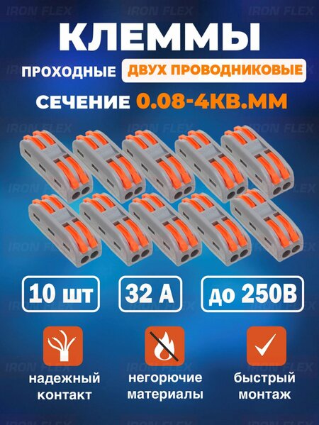 Клемма соединительная проходная Iron Flex предназначена для надежного и безопасного соединения двух проводников. Изготовлена из пластика, который обеспечивает изоляцию проводников и гарантирует безопасность использования. Особенностью данной клеммы является наличие рычажков, которые обеспечивают надежный зажим кабелей. Это позволяет использовать клемму для присоединения проводов разных сечений от 0,08 до 4 мм². Через клемму можно соединять алюминиевые и медные провода. В комплекте поставки вы найдете 10 штук клемм соединительных для проводов, что позволит вам с легкостью выполнить все необходимые соединения. Выбирая клемму соединительную Iron Flex, вы получаете надежное и безопасное решение для соединения двух проводников разных сечений. Компактный размер и простота использования делают эту клемму отличным выбором для любого монтажа.