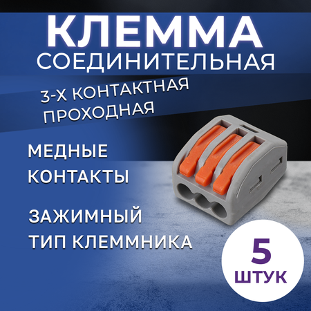 Клеммы WAGO для проводов. Набор соединительных клемм на 3 контакта Ваго, 5 штук. Универсальные трехпроводные клеммники соединяют три электрических кабеля с зажимами, аналогичными Wago. Ваго-клеммники — это аналог клемм Wago для проводов. Это универсальные соединительные клеммы, которые позволяют соединить три электрических кабеля с помощью зажимов. Клеммники Ваго предназначены для многоразового использования и подходят для быстрого подключения различных типов одножильных и многожильных проводов, включая тонкопроволочные медные и алюминиевые провода сечением до 4 мм². Они обеспечивают надёжное соединение проводов, защищая их от повреждений и исключая возможность короткого замыкания. Корпус клеммников изготовлен из самозатухающего пластика ПВХ, а контакты — из лужёной латуни. Для установки клеммников не требуется специальный набор инструментов. Клемма имеет контактную группу типа Cage Clamp без винтов и устанавливается с помощью оранжевых рычажков. В корпусе клеммника есть специальный паз для размещения рычага в закрытом положении, что предотвращает случайное отсоединение проводника. Клеммник также позволяет измерять параметры цепи с помощью тестера без необходимости припоя, ремонта или разборки соединения. Это обеспечивает безопасность и порядок в распределительной коробке. Для крепления проводов требуется только зачистка их концов. Клеммники Ваго поставляются в коробке. Они подходят для использования в цепях переменного и постоянного тока напряжением до 400 В и номинальным током 32 А при напряжении 250 В.