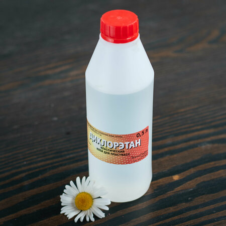 Достоинства:обыкновенный дихлорэтан большого объёма Недостатки:Какие тут могут быть недостатки Комментарий:хотел дихлорэтан большого объёма купил пол-литра Меня всё устраивает. на основе дихлортэна можно делать клей для пластмассы с наполнителем из мелко нарезанных кусочков пластмассы оргстекла или полистирола, можно использовать непосредственно как клей без добавок. Однако следует помнить, что дихлорэтан крайне ядовит поэтому как минимум работать нужно с ним в открытом хорошо проветриваемом помещении, Категорически не допускать попадания в руки к детям. хранить его лучше в тёмном прохладном месте, вылив в пузырёк с клеем мл 20-30 дистиллированной воды, вода легче клея и будет лежать на поверхности клея, своеобразной герметичной прослойкой и не даст возможности дихлорэтану быстро испарятся.