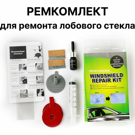 Набор для ремонта лобового стекла автомобиля: 5 пленок. 1 шприц. 3 мл активного вещества (высыхает только под ультрафиолетовыми лучами). 3 круга скотча. 1 держатель шприца. 1 лезвие