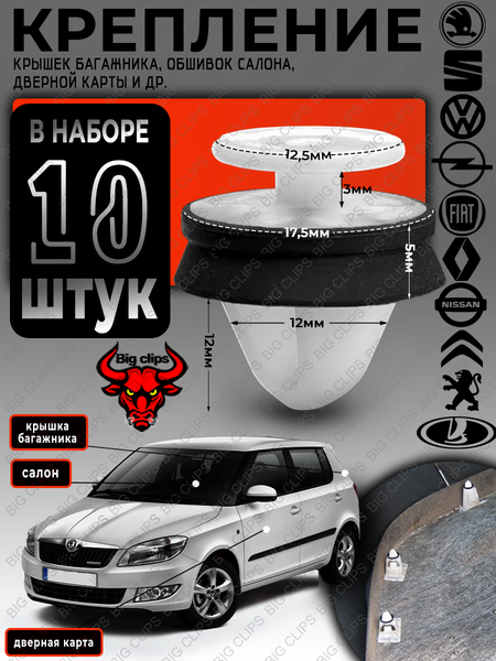 Набор крепежных клипс включает в себя необходимое количество -10 штук для отверстий 12мм для удобства и экономии времени при ремонте или обслуживании автомобиля. Основные марки автомобилей, для которых подходят крепежные клипсы Volkswagen, skoda, Seat, Nissan, Opel, Lada, Citroen, Fiat, Peugeot, Renault. ОЕМ № 9654280780; 6991Y8; 95508747; 5J0867276 ; 7703077469 Клипсы крепежные автомобильные можно быстро зафиксировать на любую деталь легкового авто, автобуса, грузового авто для обшивки дверей, салона, багажника самостоятельно без поездки в автосервис. Размеры автомобильных клипс для иномарок 12мм, как указаны на первом фото. Цвет автомобильного крепежа может немного отличаться в зависимости от освещения и уровня насыщенности камеры. Наши клипсы изготовлены из надежного и эластичного нейлона. Автомобильный крепеж устойчив к агрессивным средам: маслам, антифризам, бензинам и сохраняют свои свойства в диапазоне температур от −60 до +100С. Мы предоставляем 14 дней гарантии со дня покупки на случай брака или если товар не подошел. Ваше удовлетворение – наш приоритет! Кроме универсальных клипс у нас широкий выбор продукции – шурупы, болты, винты, закладные, заклепки, хомуты, стяжки, пластиковые ежики, пистоны, клипсы под саморезы, пластиковые заклепки, саморезы автомобильные разных размеров и диаметров, наборы клипс и наборы съёмников для автомобиля и другие ремкомплекты, аксессуары и инструменты для вашего авто. Предназначение клипс и саморезов: крепления обшивок дверей, багажника, салона, подкрылков, локеров, брызговиков, порогов, нижней защиты различная, расширителей арок, бамперов передних-задних, усилителей бамперов, внутренних элементов бамперов, защиты двигателя, решеток, фар, подкапотного пространства, обшивки капота, крепежных элементы из металла для крепления молдингов дверей. Все, что может понадобиться для ремонта вашего авто! Ремкомплект автомобильный – отличный вариант для подарка любителям авто!