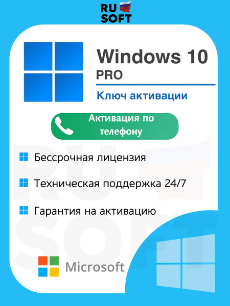 Что вы получаете? - Официальная лицензия Microsoft – полная легальность, пожизненная активация. - Активация по телефону – не требует интернета, подходит для корпоративных и изолированных систем. - Поддержка всех обновлений – доступ к последним версиям Windows 10 Pro без ограничений. - Совместимость – работает на любом ПК/ноутбуке с соответствием системным требованиям. - Оригинальный ключ – не пиратский и не корпоративный (Volume License). Лицензионная чистота и безопасность: - Ключ официально выпущен Microsoft, не является пиратским или корпоративным (Volume License). - Полностью соответствует требованиям EULA (лицензионное соглашение Microsoft). - Гарантирует доступ ко всем обновлениям и исправлениям безопасности. - Приобретая лицензию виндоус 10 про ( профессиональная ) у нас, вы гарантированно получаете: лицензионное программное обеспечение Microsoft windows 10 с пожизненной гарантией; техподдержку в любом удобном формате на весь период пользования; инструкцию по скачиванию, установке и активации windows 10 pro ключ. Преимущества Windows 10 Pro: - BitLocker – шифрование данных. - Hyper-V – встроенная виртуализация. - Групповые политики (GPO) – управление корпоративными ПК. - Удаленный рабочий стол (RDP) – доступ к компьютеру из любой точки. - Поддержка до 2 ТБ ОЗУ (vs 128 ГБ в Home). Системные требования: Процессор 1 ГГц+, ОЗУ 1 ГБ (32-bit) / 2 ГБ (64-bit). 20 ГБ места на диске, экран 800×600+, DirectX 9. Кому подойдет? - Бизнесу – легальная ОС для офисных ПК. - IT-специалистам – Hyper-V и GPO. - Геймерам – стабильная работа. - Владельцам старых ПК – активация без интернета. Почему RUSOFT? - Официальные лицензии Microsoft. - Гарантия подлинности и безопасности. - Профессиональная поддержка. Инвестируйте в стабильность и безопасность с Windows 10 Pro!
