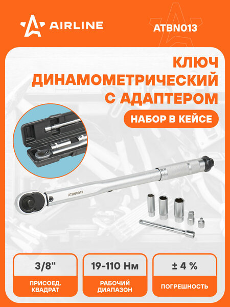 Ключ динамометрический 3/8" 19-110Нм, набор 7 пр(адапт1/4"1/2"голов14,17,19удл150), кейс Описание: Динамометрический ключ применяется в различных сферах профессиональной деятельности для затяжки резьбовых соединений с точно заданным моментом. Достижение заданного момента сопровождается ощутимым щелчком и небольшим холостым ходом. Ключ изготовлен из высококачественной стали, что придает увеличенный рабочий ресурс и надежность в эксплуатации. Металлическая рукоятка имеет шероховатую поверхность для надежной фиксации в руке и предотвращения проскальзывания. Прочный храповый механизм выполнен из закаленного сплава хроммолибденовой стали. Финишное прочное хромированное покрытие защищает ключ от воздействия коррозии, делает его более износостойким. Характеристики: Артикул: ATBN013 Количество зубьев (трещоточный механизм): 45 Присоединительный квадрат: 3/8" Min значение рабочего диапазона, Нм: 19 Max значение рабочего диапазона, Нм: 110 Погрешность, ±%: 4 Длина, мм: 370 Комплектация: Ключ динамометрический - 1 шт. Кейс пластиковый - 1 шт. Удлинитель 3/8" 150 мм - 1 шт. Адаптер с 3/8" на 1/2" - 1 шт. Адаптер с 3/8" на 1/4" - 1 шт. Головки торцевые шестигранные 3/8" 14,17,19, (L-64мм) - 1 шт. Инструкция - 1 шт. Гарантийный талон - 1 шт. Гарантия: от 1 года.