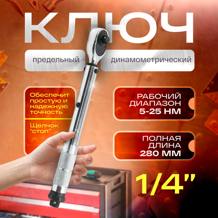 Трещоточный динамометрический ключ щелчкового типа позволяет точно ограничить прилагаемое усилие в диапазоне момента 5-25 Нм для затяжки крепежа. Особенности : -обеспечит полный контроль над усилием затяжки резьбовых соединений. -для домашнего и профессионального использования в автосервисах, станциях технического обслуживания и промышленных предприятиях. -применяется при затягивании крепежа с регулируемым значением крутящего момента. -имеет простую и надежную конструкцию- -обеспечивает высокую точность измерений -храповый механизм устойчив к интенсивным нагрузкам -помогает предотвратить поломку крепежа Характеристики : Тип динамометрического ключа - предельный Посадочный квадрат (дюйм) - 1/4 Минимальное усилие - 5 Нм Максимальное усилие - 25 Нм Щелчок - да Направление действия - правая и левая резьба Изготовлен из хромованадиевой стали