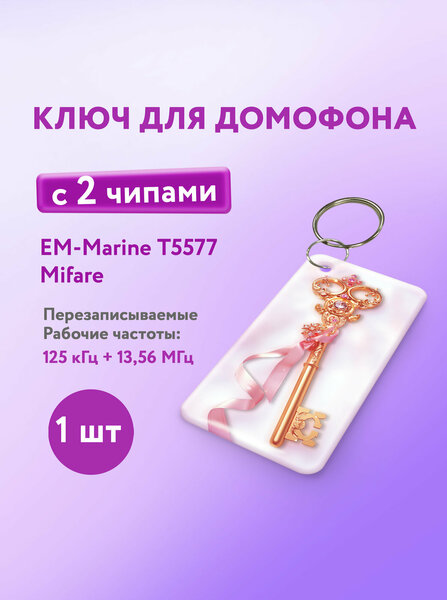 Ключ для домофона с двумя чипами, EM-Marine и Mifare является универсальным решением для доступа в жилые и коммерческие здания. Чип EM-Marine T5577 работает на частоте 125 кГц, а чип Mifare — на частоте 13,56 МГц. Т. к. стандарты разные, то не создают друг другу помех при считывании. Товар собственного производства. Изготавливается в России под брендом KeyBox. Комбинированный RFID-брелок является заготовкой для копирования ключа от домофона. Если не знаете, какой чип установлен у вас, двухформатный брелок выручит. Обратитесь в мастерскую для дублирования вашего домофонного ключа. Благодаря небольшим размерам (2,4 см на 5 см) гибридный брелок удобнее карты доступа. Вы сможете прикрепить его к чему угодно и он всегда будет под рукой. Электронный ключ для домофона EM-Marine + Mifare перезаписываемый. Мастер, используя специальный программатор, перезапишет информацию на чипах, настройки будут обновлены в считанные секунды. Бесконтактный двухчастотный брелок удобен, когда на одном объекте СКУД используются считыватели разных стандартов. Также удобен, если в разных зданиях установлены разные ридеры. Двухформатный ключ становится универсальным, откроет два замка. Например, дверь подъезда и калитку садика. Совместим с большинством моделей домофонов и систем контроля доступа, поддерживающих стандарты Mifare Classic 1K 13.56 МГц и EM-Marine 125 кГц. Вы сможете использовать его не только дома, но и в офисе в качестве электронного пропуска. Двухчиповой брелок водонепроницаемый, устойчив к загрязнению и солнечным лучам. Стильные дизайны в наличии. Данная модель с изображением ключика.