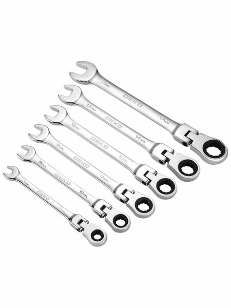Набор комбинированных трещоточных шарнирных ключей DEKO RW02 8-17 мм, 6 предметов - универсальный инструмент для обслуживания автомобиля, ремонта техники и выполнения работ в доме или на даче. Ключи изготовлены из прочной хром-ванадиевой стали, что обеспечивает высокую износостойкость и долгий срок службы даже при интенсивной эксплуатации. Каждый ключ в наборе оснащён трещоточным механизмом с реверсом, что позволяет ускорять процесс закручивания и откручивания крепежа без снятия инструмента с гайки или болта. Шарнирная конструкция головки обеспечивает доступ к труднодоступным местам, что особенно актуально при ремонте машины или автомобиля в ограниченном пространстве. Набор включает ключи размеров 8, 10, 12, 13, 14 и 17 мм - наиболее востребованные размеры для большинства бытовых и профессиональных задач. Компактная упаковка облегчает хранение и транспортировку, делая комплект удобным для использования как в гараже, так и на выезде. Трещоточные шарнирные ключи DEKO подходят для регулярного обслуживания авто, выполнения монтажных и слесарных работ на даче или дома. Надёжная фиксация, эргономичная форма и качественные материалы делают этот набор оптимальным выбором для автолюбителей, мастеров и владельцев частных домов.