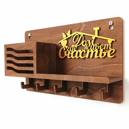 Ключница настенная "Дом, где живет счастье" с 5 крючками и полкой - это функциональный предмет интерьера и стильный аксессуар, который подчеркнет вашу индивидуальность и добавит уюта в ваш дом. Ключница выполнена из качественной березовой фанеры и покрытой тонирующей пропиткой, что делает ее долговечной и надежной. На лицевой стороне ключницы есть 5 крючков, на которые можно удобно вешать ключи, наушники, валик для чистки одежды, поводок для выгула собак и многое другое. Эти крючки закреплены прочно и надежно, что обеспечивает безопасность хранения. Удобная полочка с бортиком и декоративным кармашком, где можно хранить мелкие предметы: мелочь или мобильный телефон, солнцезащитные очки, крем для обуви или искусственный декоративный цветок, практична в применении. Ключница настенная с полкой станет отличным подарком для ваших близких или друзей. Будет радовать глаз своим оригинальным дизайном и функциональностью. Стильный дизайн позволяет ей отлично вписаться в любой интерьер, придавая ему особый шарм и уют. Каждая ключница собрана вручную в мастерской. С заботой и любовью от мастера изделия. Выбирая эту ключницу, вы делаете ставку на качество, стиль и удобство. Размеры ключницы 245*150*60 мм. Крепеж в комплект не входит.