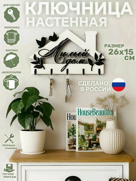 Ключница настенная — это удобное и практичное решение для хранения ключей в прихожей. Она крепится на стену, что позволяет сэкономить пространство и поддерживать порядок в доме. Такая ключница станет отличным подарком на новоселье, ведь она помогает организовать хранение ключей и делает их поиск быстрым и удобным. Вешалка для ключей на стене — это не только функционально, но и эстетично, она может стать стильным дополнением интерьера прихожей. Настенная ключница подойдёт как для квартиры, так и для дома. Она поможет вам всегда держать ключи под рукой и избежать неприятных ситуаций, когда они теряются или забываются. Ровная обратная сторона позволяет установить ключницу на липучку или скотч без сверления