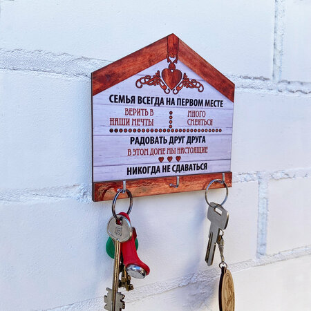 Настенная ключница в виде Домика "Семья всегда на первом месте" – это не просто функциональный предмет интерьера, но и оригинальный подарок для близких. Выполненная из дерева, она гарантирует долговечность и экологичность, а также придает уют и теплоту вашему дому. А металлические крючкхорошо держат вес. Ключница имеет размеры 14х14 см и глубину всего 3 см, что позволяет разместить ее даже в небольшом пространстве, не занимая много места. В комплекте идут три металлических крючка, что обеспечивает быстрый и удобный доступ к ключам, а также предотвращает их потерю. Особенностью данной модели является коллаж "Семья всегда на первом месте", который подчеркивает важность семейных ценностей и традиций. Это делает ключницу не только удобным местом для хранения ключей, но и символом семейного уюта и тепла. Выбирая настенную ключницу в виде Домика "Семья всегда на первом месте", вы получаете не только удобное и практичное решение для хранения ключей, но и стильный элемент декора, который подчеркнет ваш вкус и индивидуальность.