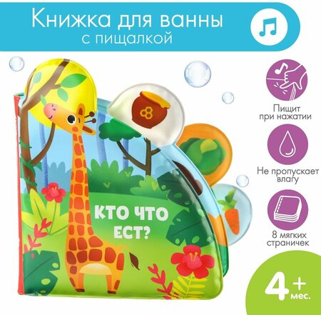 Книжка-игрушка "Кто что ест?", для ванны, с окошками, пищит при нажатии, не пропускает влагу, 8 мягких страничек, для детей и малышей