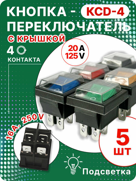 Кнопка КСД4 с крышкой - это надежный электрический элемент, который идеально подходит для использования в различных системах управления. С её помощью можно легко и удобно включать и выключать электрические цепи без усилий. Данная кнопка имеет 4 контакта и способна работать при напряжении 125В и токе 20А или до 250В и токе до 16А, что делает её универсальным решением как для домашнего использования, так и для профессиональных установок. Кнопка имеет защитную крышку, что обеспечивает защиту от попадания пыли и грязи. Монтаж осуществляется без применения винтов на плоских панелях толщиной от 0.8 мм до 3 мм. Подключение контактов осуществляется плоской клеммой 6.6 мм, либо с помощью пайки. Отлично подходит для установки в схемы освещения, управления электрооборудованием, электронагревательными приборами, такими как камины, обогреватели, дуйчики, а также может быть использована в различных устройствах, где требуется простое и надежное переключение. Широкое применение для автомобилей и других транспортных средств: мотоциклов, скутеров, снегоходов, квадроциклов, лодок, катеров, яхт и др. Применение: - Управление подсветкой салона - Включение и выключение ближнего/дальнего света - Управление противотуманными фарами и ходовыми огнями - Управление дворниками - Обогрев салона - печка/кондиционер - Подогрев сидений, обогрев стёкол и зеркал Характеристики: Коммутируемое напряжение - (АС) - 125/ 250 В; Коммутируемый ток - 16А/20А Диапазон рабочих температур - -25…+85 ºС Диаметр отверстия для встраивания - 22.28.5 мм Толщина стенки для встраивания - 2 мм Глубина установочная - 29.5 мм Размеры (ш*д*в) - 25мм*31мм*35мм(вместе с клеммами) В наборе 5 кнопок - выключателей с крышкой
