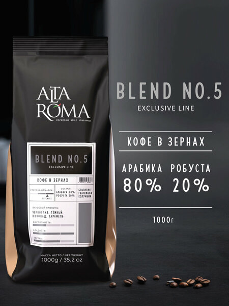 Кофе в зернах Alta Roma Blend №5 - это высококачественный продукт, созданный из смеси арабики и робусты. Благодаря этому, он обладает насыщенным вкусом с характерными нотками ореха и шоколада. Основу его профиля составляют какао ноты, а также стойкое послевкусие с ореховыми оттенками. Кофе Alta Roma Blend №5 страны произрастания зерен включают Бразилию, Гондурас и Гватемалу. Это обеспечивает разнообразие вкусовых оттенков и ароматов, которые можно ощутить при приготовлении разных видов кофе. Степень обжарки средняя, что позволяет сохранить вкус и аромат кофе, а также обеспечивает удобство приготовления различных напитков. Кофе упакован в пакет с клапаном, что гарантирует свежесть и аромат продукта. Вес упаковки составляет 1 кг, что позволяет наслаждаться кофе в течение длительного времени. Кофе Alta Roma Blend №5 подходит для приготовления различных видов напитков, включая латте, черный кофе, капучино, эспрессо и американо.