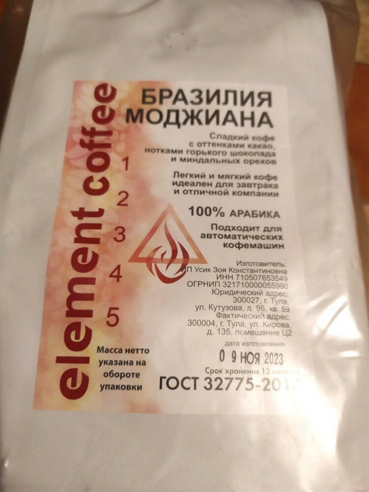 Комментарий: Кофе в упаковке с клапаном дегазации, что говорит о его свежести. Впрочем, об этом говорит и вкусный аромат, пробивающийся даже через запаянный полиэтиленовый транспортный пакет. На упаковке полная информация о производителе, есть дата упаковки (два дня ранее) и номер ГОСТа. Срок годности указан - год. Сорт мне знаком и нравится своим ароматом, и мягким вкусом, потому как я предпочитаю чёрный кофе - эспрессо. Купил две упаковки с приличной скидкой. Теперь уж я доволен. Спасибо.