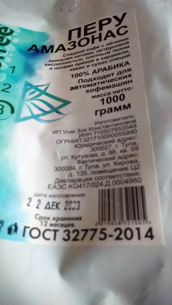 Комментарий: Первый раз покупала перуанский кофе от этого производителя! Действительно свежайшая обжарка, это очень важно для меня. Буду брать ещё, если появится в продаже. Спасибо, производителю за качественный продукт, надеюсь качество со временем не начнет страдать! Фото с зернами кофе, в жизни имеют более светлый цвет, что соответствует средней обжарке. Запах шикарный, чувствуется даже через клапан дегазации!