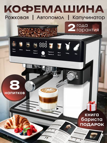 С этой кофемашиной автоматической зерновой с капучинатором и кофемолкой вы почувствуете себя настоящим бариста у себя дома. Это не просто кофе аппарат, а универсальное решение "всё в одном" для создания идеального эспрессо, капучино или латте. Мощная и стильная, она подойдёт как для домашнего использования, так и как кофе машина для кафе. Устройство сочетает в себе возможности кофемашины зерновой с кофемолкой, кофемашины рожковой с капучинатором автоматическим и кофемашины электрической с автоотключением. Поддерживает молотый, зерновой кофе, капсулы и чалды — настоящий функционал кофемашины 3 в 1. Благодаря встроенному автоматическому капучинатору, вы сможете создавать плотную молочную пену одним нажатием — как в профессиональной кофейне. Эта кофемашина автоматическая с капучинатором имеет резервуар для воды 2600 мл, контейнер для молока 500 мл, мощность 1350 Вт. Компактные размеры — 36×30×30 см — позволяют разместить её на любой кухне. Управление интуитивно понятное, корпус выполнен в современном дизайне. Кофеварки рожковая с капучинатором автоматическим подходит для зернового и молотого кофе, а также совместимо с капсулами. Это отличная кофемашина зерновая для дома, объединяющая всё лучшее от капсульных, рожковых и автоматических моделей. С такой кофемашиной с капучинатором и кофемолкой автоматической вы сами станете автором идеального кофе. Наслаждайтесь любимыми вкусами каждый день у себя дома — легко и с удовольствием.